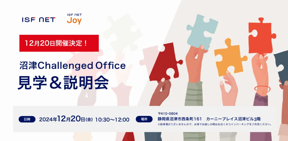株式会社アイエスエフネットは、2024年12月20日(金)に沼津支店で「沼津チャレンジドオフィス見学&説明会」を開催します。本イベントは、障がい者雇用に関心がある方々に向けて、実際の現場を見学しながら、そのポイントや課題について知識を深める貴重な機会です。
