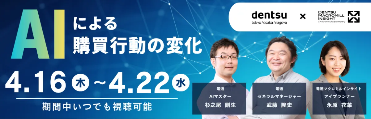 株式会社電通マクロミルインサイトは、株式会社電通と共催したウェビナー「AIによる購買行動の変化」を再配信することになりました。近年、生成AIやAIエージェントが登場し、我々の生活の中でAIが果たす役割は大きくなっています。特に、日常の情報収集や判断において、AIを活用する人が増えてきています。しかし、購買行動に関しては、まだまだ発展途上にあります。生活者の行動や意識には明らかに変化が見られ、それを理解することがマーケティングにおいて重要なポイントとなっています。