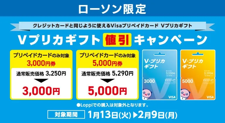 2026年1月13日(火)から2月9日(月)の期間、全国のローソンおよびナチュラルローソン、ローソンストア100において、Vプリカギフトの特別キャンペーンが実施されます。このキャンペーンでは、通常価格よりもお得な金額でVプリカギフトを購入することができます。具体的には、次のような割引が適用されます。