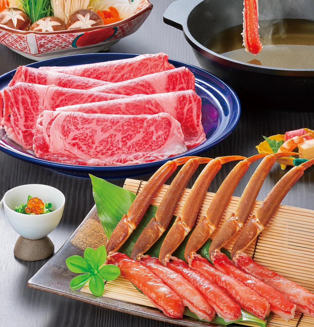 内容: 牛・かにしゃぶ、茹でがに、小鉢二種、サラダ、かに刺身、きしめん、デザート