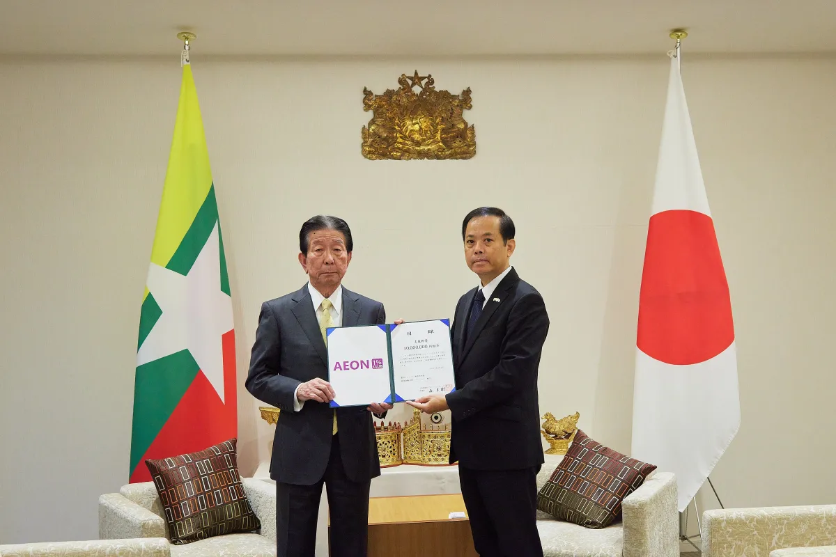 4月2日、水曜日、駐日ミャンマー連邦共和国大使館において、イオンワンパーセントクラブは1,000万円相当の支援物資を贈呈しました。支援物資には、飲食料品、衛生用品、生活必需品など、被災者の生活再建に役立つアイテムが含まれています。この贈呈式には、駐日ミャンマー連邦共和国特命全権大使のソー・ハン閣下、イオンワンパーセントクラブ理事長の森美樹が出席し、共にこの支援活動の意義を確認しました。