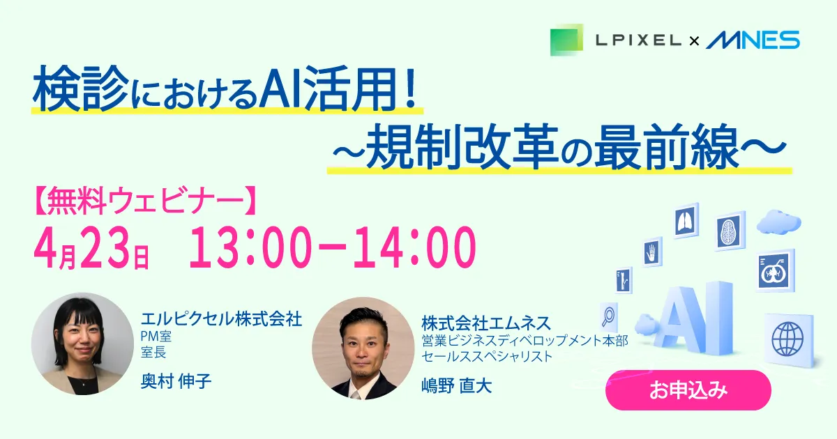2026年4月23日(日)、エルピクセル株式会社と株式会社エムネスが共催するオンラインセミナー「検診におけるAI活用!~規制改革の最前線~」が開催されます。このイベントでは、最新の医療用AI技術がどのように検診に応用されているのか、その最前線を知る貴重な機会となっています。