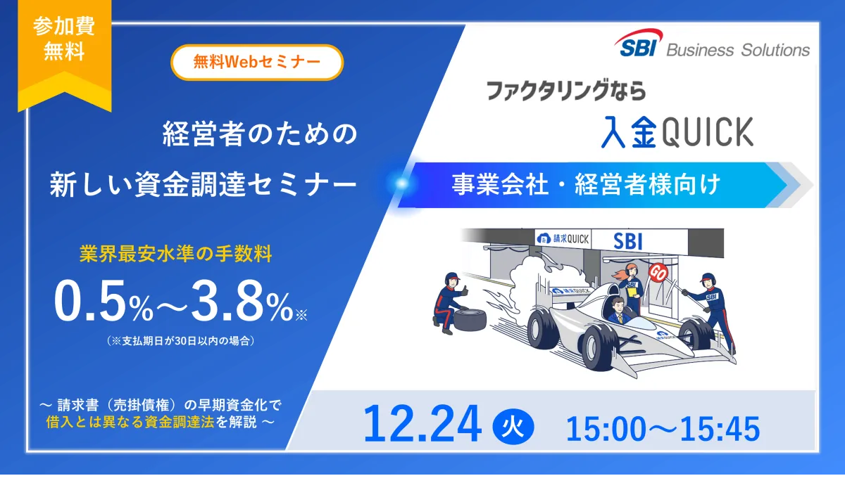 SBIビジネス・ソリューションズ株式会社は、総合フィンテックソリューション企業であるSBI FinTech Solutionsの子会社で、事業会社向けにバックオフィス支援サービスを提供しています。その中で、特に注目を集めているのがオンライン型ファクタリング「入金QUICK」です。2024年12月24日(火)15時から、業界最安水準の手数料0.5%~3.8%で利用できるこのファクタリングサービスに関するセミナーが開催されます。