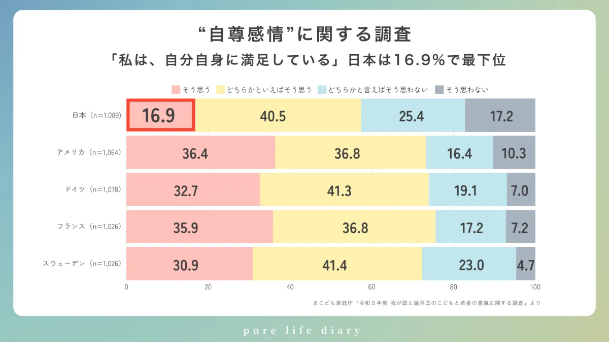 日本の中高生の自尊感情は16.9%と低く、今までの調査でも多くの生徒が将来に対して漠然とした不安を抱えていることが示されています。特に、自己比較からくる自己肯定感の低下や、アイデンティティの喪失といった問題が深刻化しています。さらに、不登校や自殺の増加も懸念されており、若い世代の心の健康を守る必要性が一段と強まっています。