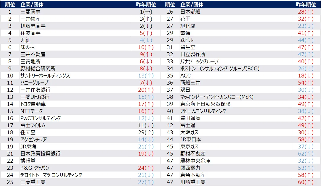 その一方で、メーカー・インフラ業界が人気上昇中です。味の素、サントリー、資生堂、日立などの企業が順位を上げ、特に安定性や長期雇用への期待が高まっていることが影響していると考えられます。また、インフラ業界も徐々に注目を集めており、JR東海やJR東日本などがランクアップを果たしました。