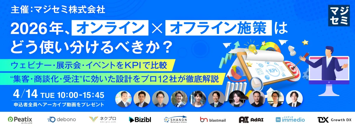 このウェビナーでは、集客、商談化、受注の各プロセスにおいて、どのKPIを見るべきかを整理し、オンラインとオフライン施策を同じ視点で比較する方法について解説します。参加企業の中から12社のプロフェッショナルが登壇し、実際の成果につながる施策設計や判断基準について詳細に紹介します。