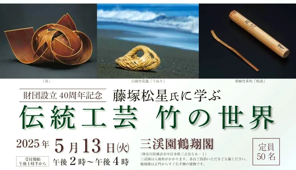 2025年5月13日、横浜市の三渓園鶴翔閣にて、竹工芸の第一人者であり人間国宝の藤塚松星氏を迎えた特別講演が開催されます。竹材の持つ魅力やその用途について、また歴史の中で育まれてきた竹工芸の繊細な技術について学べる貴重な機会となります。