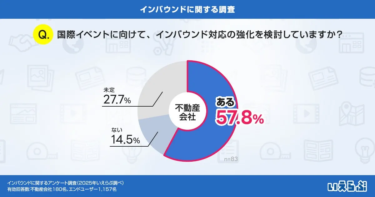 国際イベントへのインバウンド強化を検討している不動産会社はわずか7.2%でしたが、イベント終了後も外国人入居者の受け入れを続けるとした企業は57.8%にのぼりました。この結果から、外国人の受け入れが一時的なものでなく、持続可能な方向に進む期待がかかっています。