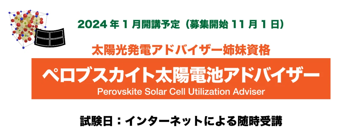 また、ペロブスカイト太陽電池資格に加えて、蓄電池アドバイザー資格も併せて取得できる合同講座も提供されています。この講座は、太陽光発電の全体像を理解し、次世代のエネルギーシステムを構築するためのスキルを磨く絶好の機会です。