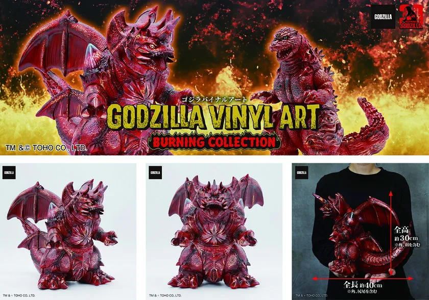 「GODZILLA VINYL ART BURNING COLLECTION」は、アートソフビファンにはたまらないシリーズです。巨体を誇るデストロイアは、紅蓮の炎をイメージした赤い塗装で再現され、ゴジラとの壮絶な戦いを彷彿とさせます。また、ソフビ作家のFrog Treeによる和風のアレンジが施された造形や、丁寧に施されたエイジング塗装により、実物以上の存在感を放ちます。今後も「バーニング」をテーマにした新たなデザインのアートソフビが続々と登場予定です。