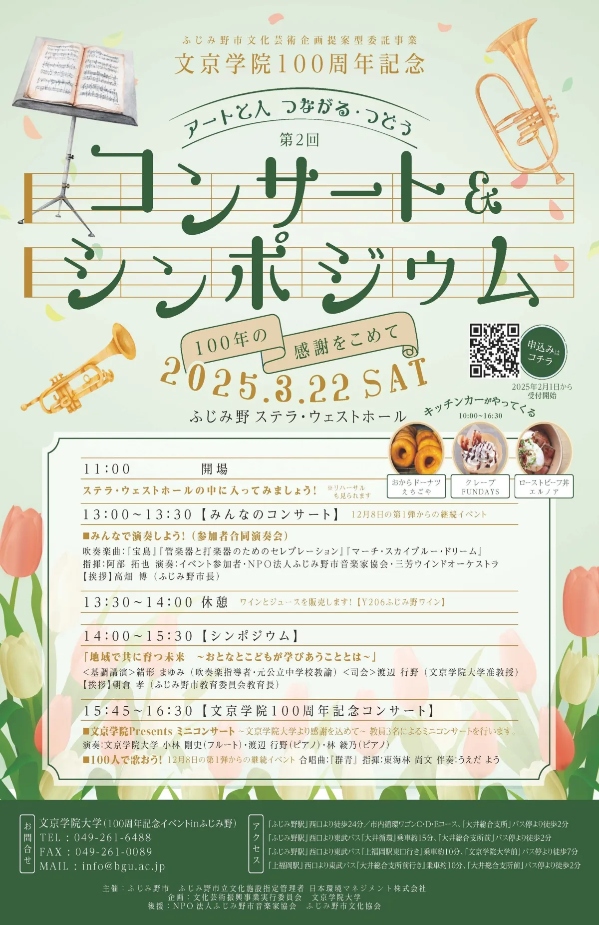 文京学院100周年記念コンサートが行われ、文京学院大学が主催するミニコンサートや、参加者合同の大合唱が予定されています。