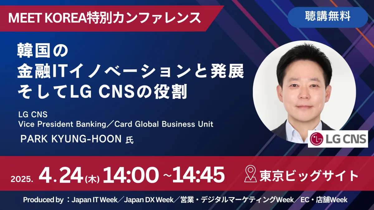 2025年4月23日水曜日から25日金曜日までの3日間、東京ビッグサイトにて開催される「Japan IT Week」内にて、特別企画「MEET KOREA」が行われます。このイベントでは、韓国を代表するIT企業であるLG CNSによる特別講演が予定されています。そのなかで、韓国における金融ITイノベーションについて深く掘り下げる機会が設けられます。