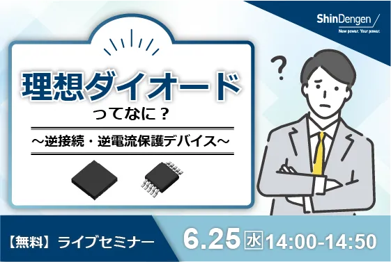 新電元工業株式会社が提供する、逆接続と逆電流を保護する新しいデバイス「理想ダイオード」に関する無料のオンラインセミナーが2025年6月25日(水)に開催されます。これは、電子機器がますます多機能化する中で、新たな逆接続保護・逆電流防止の技術を学ぶ絶好の機会です。