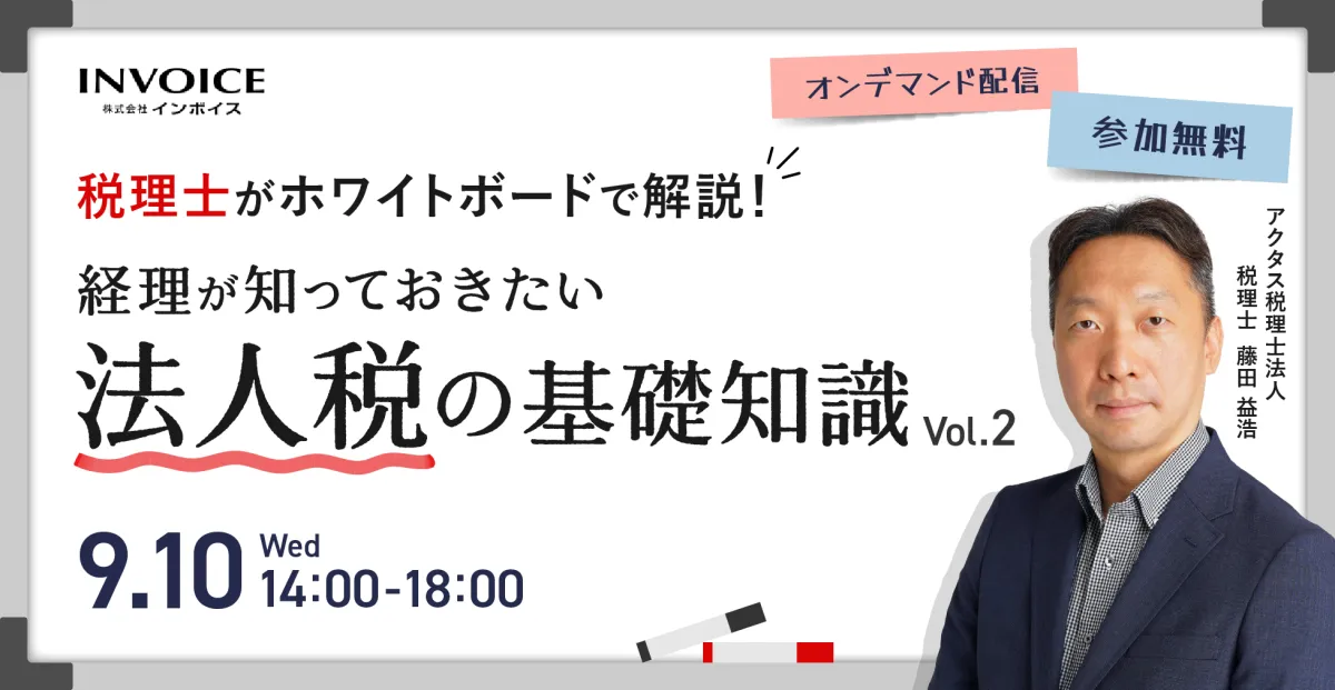 株式会社インボイスは、2025年9月10日(水)に税理士による「経理が知っておきたい法人税の基礎知識セミナーvol.2」を開催することを発表しました。このセミナーは、税理士の藤田益浩氏を迎えて、オンデマンド形式で配信されます。経理の実務に役立つ具体的な知識を深める絶好の機会です。