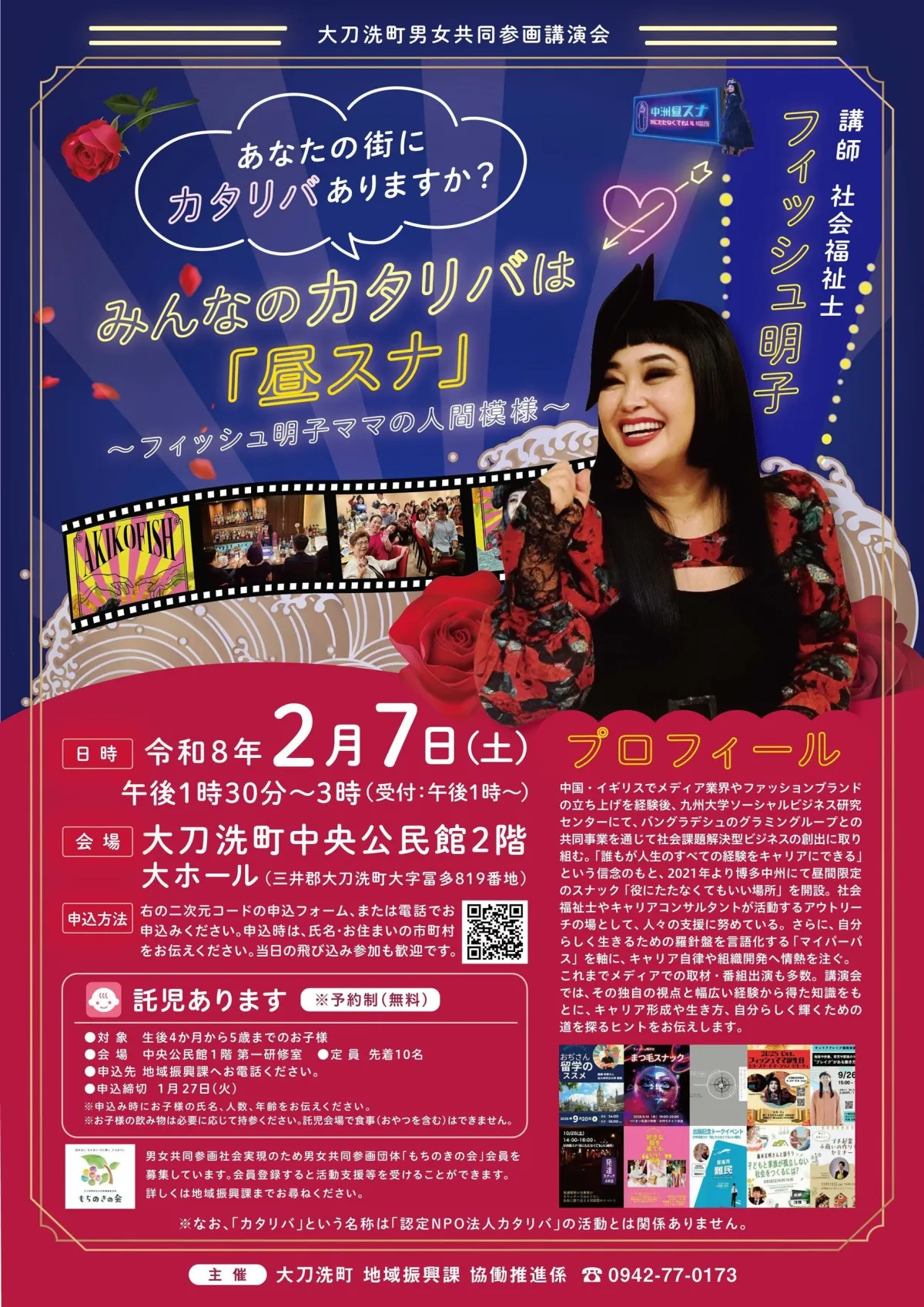 福岡県大刀洗町で行われる「男女共同参画講演会」は、人間模様に関する見識を深める絶好の機会です。講師には、フィッシュ明子さんを迎え、独自の視点と豊富な経験をもとにした洞察をお楽しみいただけます。