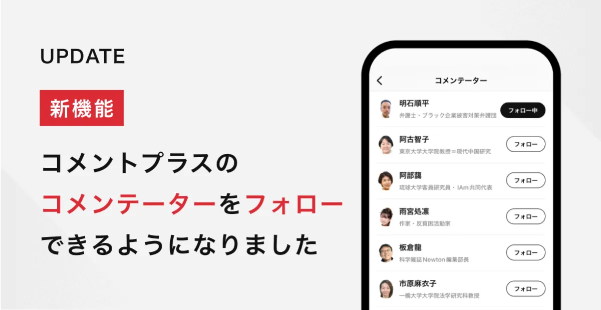 「コメンテーターフォロー」機能は、ユーザーが気になる専門家をわずかワンタップでフォローできる簡便さが特徴です。フォローしたコメンテーターの新しいコメントは、アプリ内の「フォロー中」タブやタイムラインで一覧化され、手軽にチェックできるようになっています。