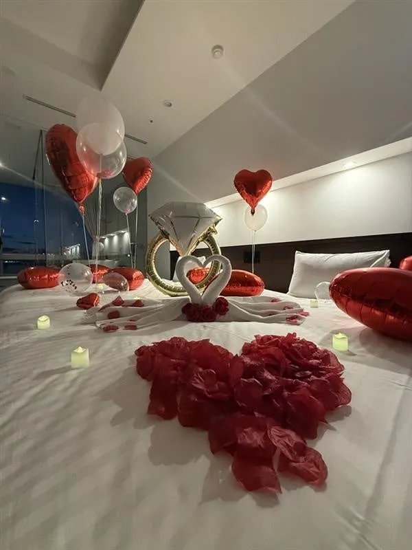 特別な記念日には、赤いハートのバルーンを使ったデコレーションがオススメ。タオルで折にぎった白鳥が、特別な時間を象徴しています。この装飾により、ロマンチックでサプライズ感あふれる空間が出来上がり、プロポーズや大切な記念日を美しく彩ってくれます。もちろん、赤いバルーンやフラワーによって、より一層特別感が増すことでしょう。