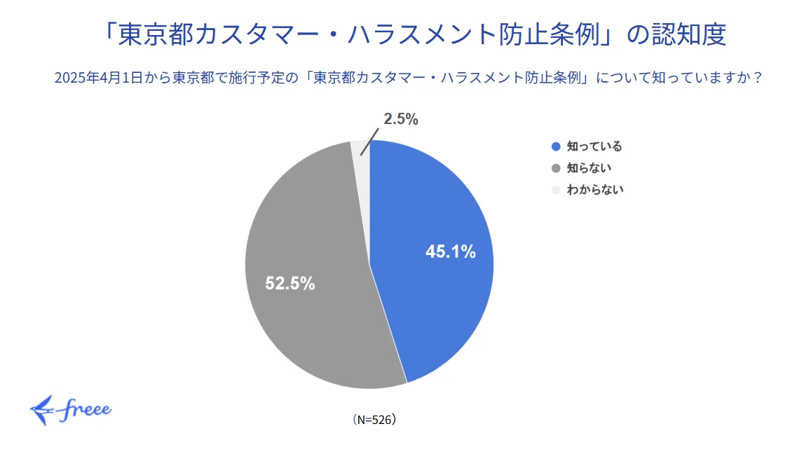 2025年4月1日から施行される「東京都カスタマー・ハラスメント防止条例」に関して、ビジネスの現場ではどのような準備が進んでいるのでしょうか。フリー株式会社が実施した調査によると、東京都内に勤務する中小企業の経営者や人事労務担当者526名を対象に行った結果、カスタマーハラスメント防止に向けた認知度や対策の状況が明らかになりました。