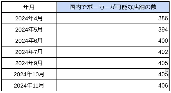 2024年11月、国内のアミューズメントポーカールームの店舗数についての調査結果が発表されました。その結果、全国での店舗数は406件に達し、徐々に新規オープンが続いていることが明らかになりました。このデータは、グローバルなデジタルマーケティングを手掛けるWindstorm Media Communications Ltd.が実施したもので、今後このトレンドを追い続ける予定です。