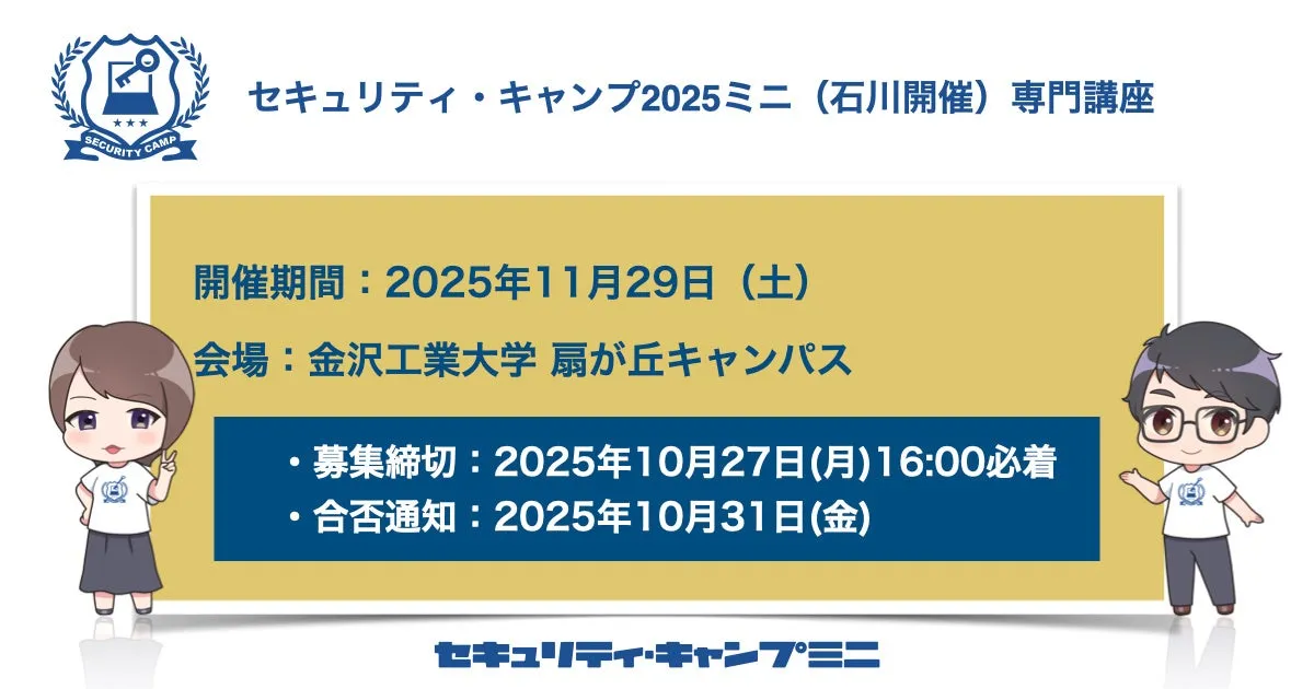 2025年11月29日(土)、金沢工業大学にて「セキュリティ・キャンプ2025ミニ(石川開催)」の専門講座が行われます。このイベントは情報セキュリティ分野に興味を持つ若者の育成を目指し、金沢工業大学や金沢大学大学院自然科学研究科、北陸先端科学技術大学院大学などの支援により開催されています。