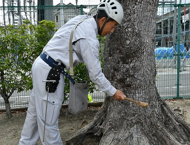 特に、自然災害時に倒木する危険性が懸念されるため、樹木医による専門的な診断も行われました。樹木医は、視覚的な点検に加え、木槌を用いて樹木内部の空洞を調べたり、鋼棒を使用して土壌内の腐食状態を確認するなど、高度な専門知識を駆使して安全を評価しました。これにより、通常の点検では見過ごしてしまう可能性のある問題も見つけやすくなります。