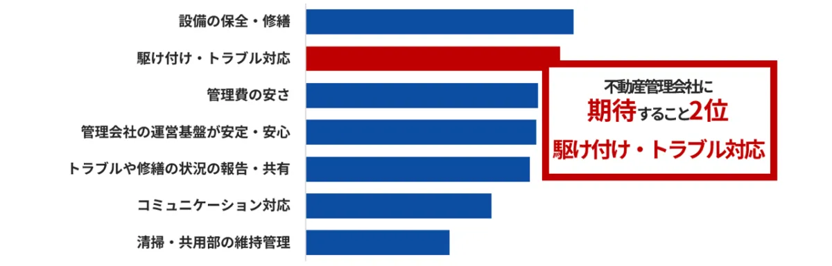 不動産管理会社に対する入居者の期待に関する調査では、「駆け付けやトラブル対応」が第2位に位置しており、これは設備の保全や修繕に匹敵する重要性を持っています。また、驚くべきことに、約75%の入居者が駆け付けサービスへの満足度が管理会社に対するイメージや評価に影響を与えると回答しています。これは、サービス品質が今や不動産管理会社の評価を左右する大きな要因となっていることを示しています。
