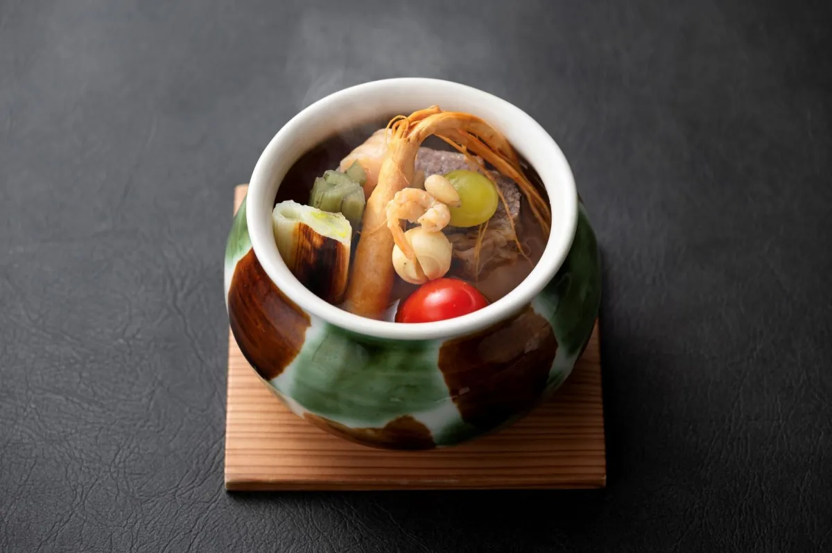 - - 続いて提供されるのは、ブランド鶏と鱶鰭を使用した名物・美濃薬膳スープ。