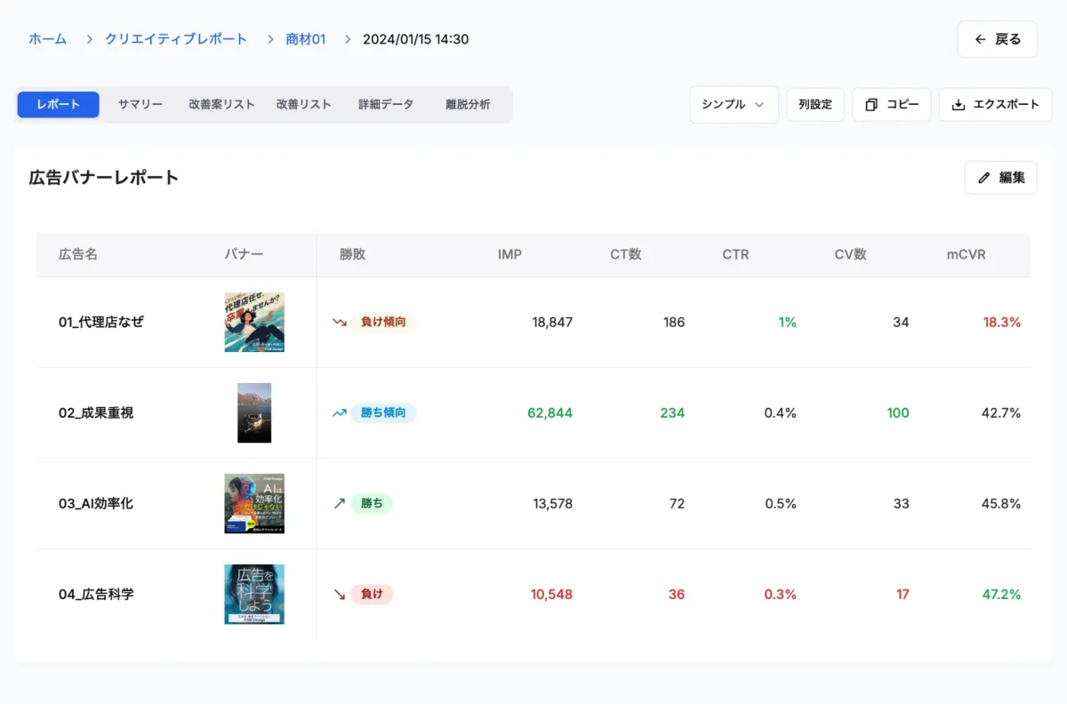 この「クリエイティブレポート」は、運用結果を画像やCSV、PDF形式でアップロードし、簡単にワンクリックで分析が完了します。AIがどのクリエイティブが勝ったのか、または負けたのかを判定し、さらにその要因を言語化して示します。これにより、広告主は勝ちパターンと負けパターンを具体的に理解し、次の運用戦略に生かせるのです。