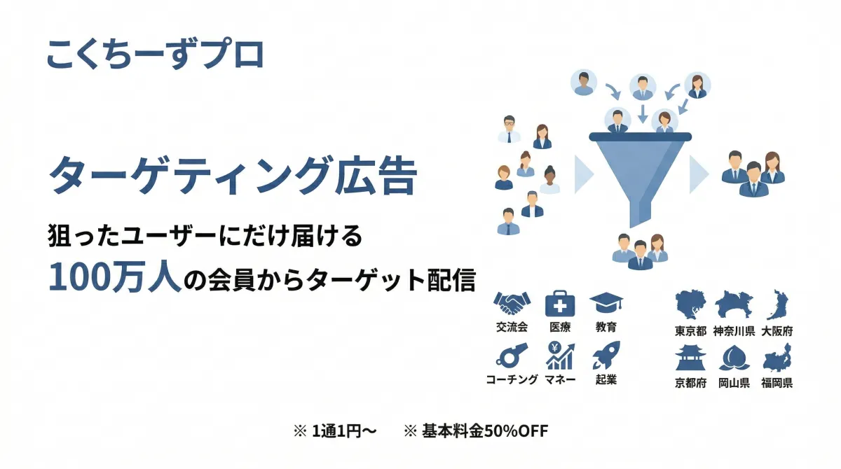「ターゲティング広告」は、こくちーずプロが100万人を超える過去の会員データを活用して、より精度の高い広告配信を実現します。広告は、所在地や興味ジャンルに基づいて配信相手を選別し、イベント情報を効果的に伝えます。