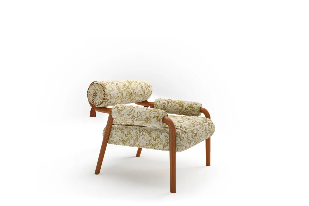 シートは、伝統的なカピトネ(ボタン留め)スタイルを現代風にアレンジしたもので、アームレストとバックレストには布張りのロールクッションを採用されています。この設計により、構造的なフォルムと快適さが両立されているのです。サイドにはパスマントリー(装飾ブレード)や繊細なタッセルが施されており、見た目のリズムと触感を生み出しています。装飾は単なるデザインの一部ではなく、構造そのものに組み込まれていることが印象的です。