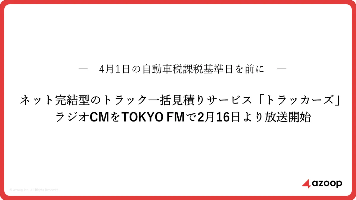2026年2月16日から、株式会社Azoopが運営するトラック一括見積りサービス『トラッカーズ』のラジオCMがTOKYO FMで放送を開始します。このCMは、特に朝の通勤・運行時間帯に多くのドライバーや運送経営者に届くよう制作され、「トラック売るなら、トラッカーズ」という明確なメッセージが20秒間で伝えられます。