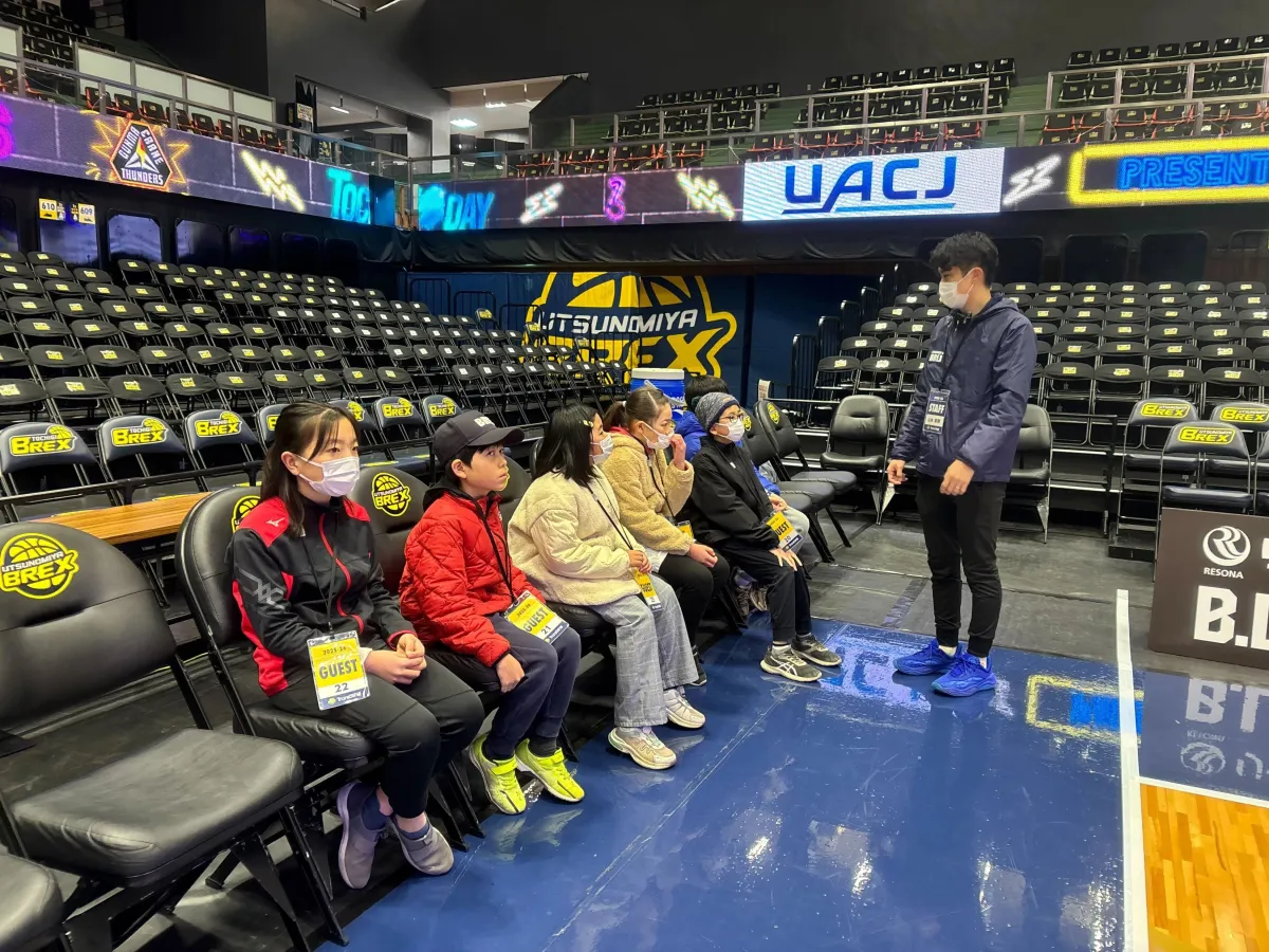 この企画は、宇都宮市の職業体験「宮っこトライ」の取り組みとして実施されました。応募者の中から厳選された6名の小学生たちは、試合前にアリーナの見学を行い、そこで多くの興味深い体験をしました。特に、アリーナの舞台裏を見学することで、プロのスポーツイベントがどのように準備されているのかを学ぶことができました。