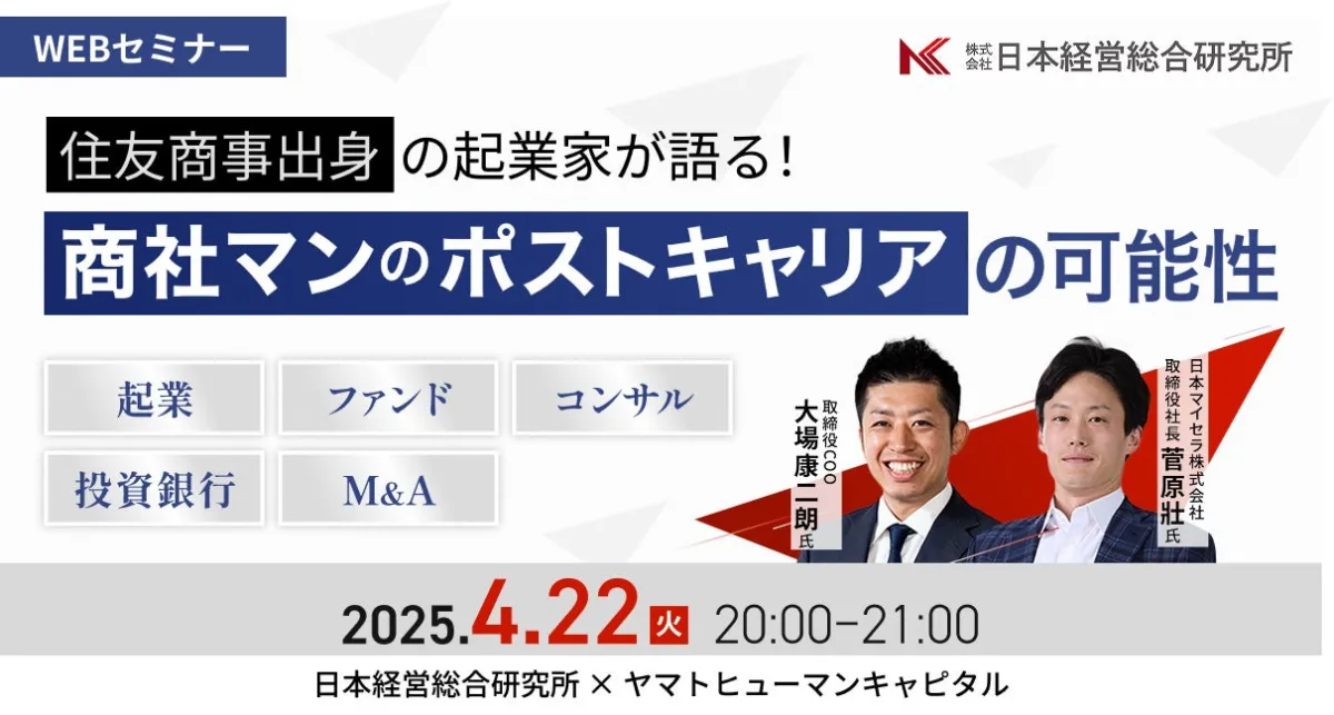2025年4月22日の夜、オンラインで行われるウェビナー「住友商事出身の起業家が語る!商社マンのポストキャリアの可能性!」が注目を集めています。このセミナーでは、住友商事出身の大場康二朗氏と菅原壯氏が登壇し、商社マンのキャリアチェンジにおける様々な可能性を深堀りします。