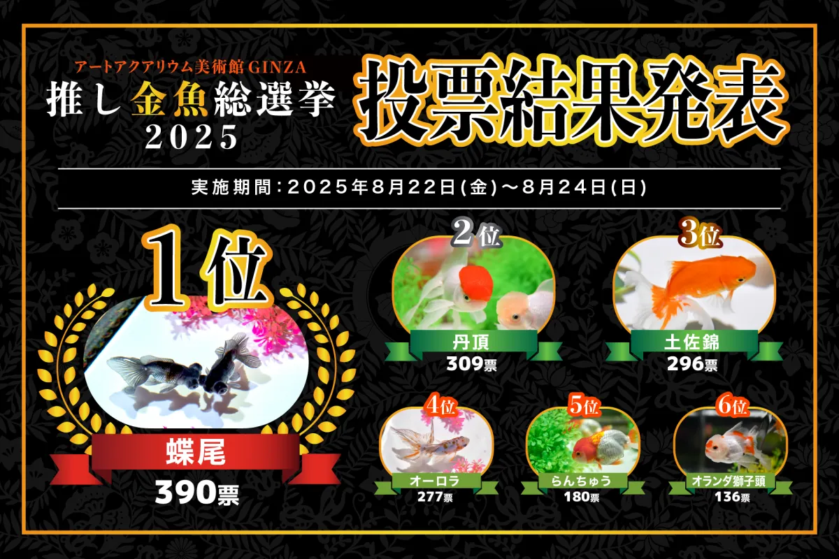 2025年に行われた「推し金魚総選挙」の結果が発表され、見事人気No.1に輝いたのは、美しい尾ひれが特徴の「蝶尾」でした。このイベントは、東京都中央区の銀座三越内にあるアートアクアリウム美術館にて開催され、来館者からは多くの票を集めました。合計1,588票の中で、蝶尾は390票を獲得し、他の金魚たちを大きく引き離してのトップという結果に。これにより、今年の「推し金魚」は蝶尾となりました。
