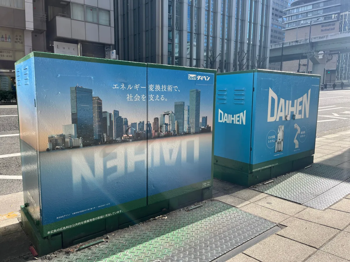大阪市内で進む「路上変圧器活用に関するガイドライン」に基づき、ダイヘンが公共の歩道環境や地域美化に寄与するための新しい広告手段を展開しています。これは、関西電力送配電と共同で行っている試みで、街をより良くするための一環として位置づけられています。