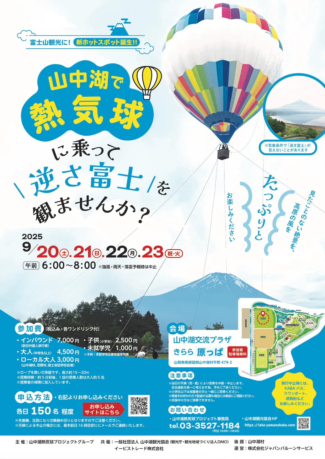 このプロジェクトは、イービストレード株式会社が中心となり、山中湖熱気球プロジェクトグループが実施するものです。まず、2025年の9月20日から23日までの4日間にわたり、朝6時から8時の間に限定開催されます。この熱気球体験では、朝の穏やかな時間帯に空気に浮かぶ熱気球から、上下に並ぶ美しい逆さ富士を一望できます。