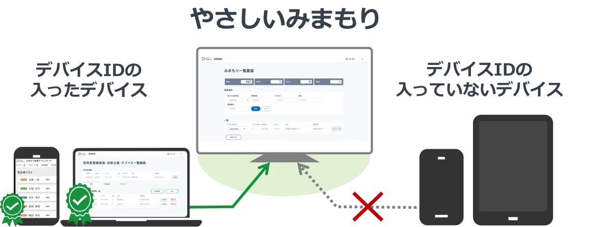 「やさしいみまもり」では、地域関係者が高齢者を見守るための端末として、「共助端末」と呼ばれるタブレットや、自らの業務のために使用する「公助端末」を用意しています。これらの端末には、サイバートラストの「デバイス ID」が導入され、認証済みの端末のみがサービスに接続できる仕組みを導入します。もしも共助端末が紛失しても、デバイス IDを無効にすることで安心して利用できるのも大きな利点です。