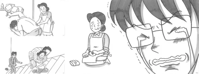 このパラパラ漫画の主人公は、母の死を受け入れきれず、実家の蚊取り線香の跡を訪れることから物語が始まります。古い箪笥を開けた時、彼は母が愛用していたサポーターの数々を見つけ、母がどれほど家族のために尽くしてくれたのかを思い出します。夜遅くまで家事をこなし、身体が不自由な父を献身的に介護する母の姿が浮かび上がり、彼の中に感謝と愛情が深まっていく様子が描かれています。