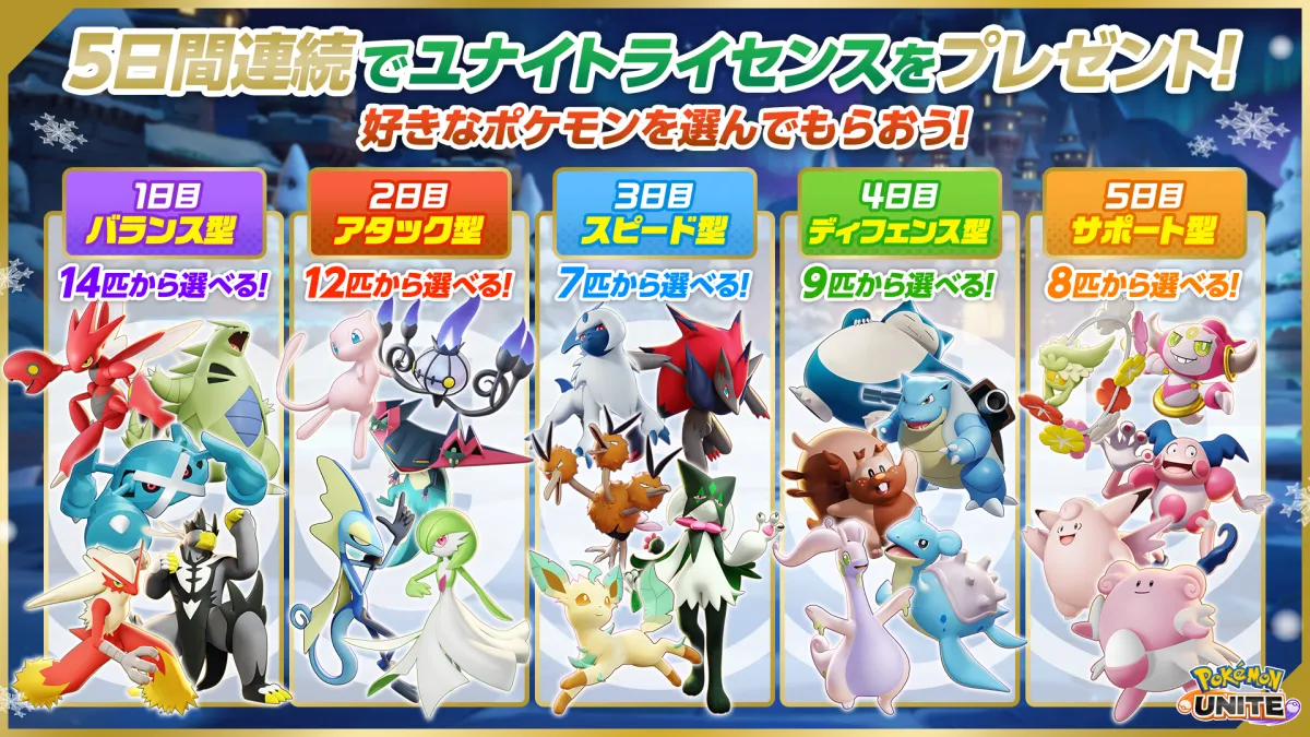 株式会社ポケモンが展開する人気ゲーム『Pokémon UNITE』(ポケモンユナイト)が、今年もクリスマスシーズンに特別なプレゼントを用意しました。12月5日から12月31日までの期間中、5日間にわたって毎日ログインすることで、特定のポケモンのライセンスを無料でゲットできるキャンペーンが実施されます!