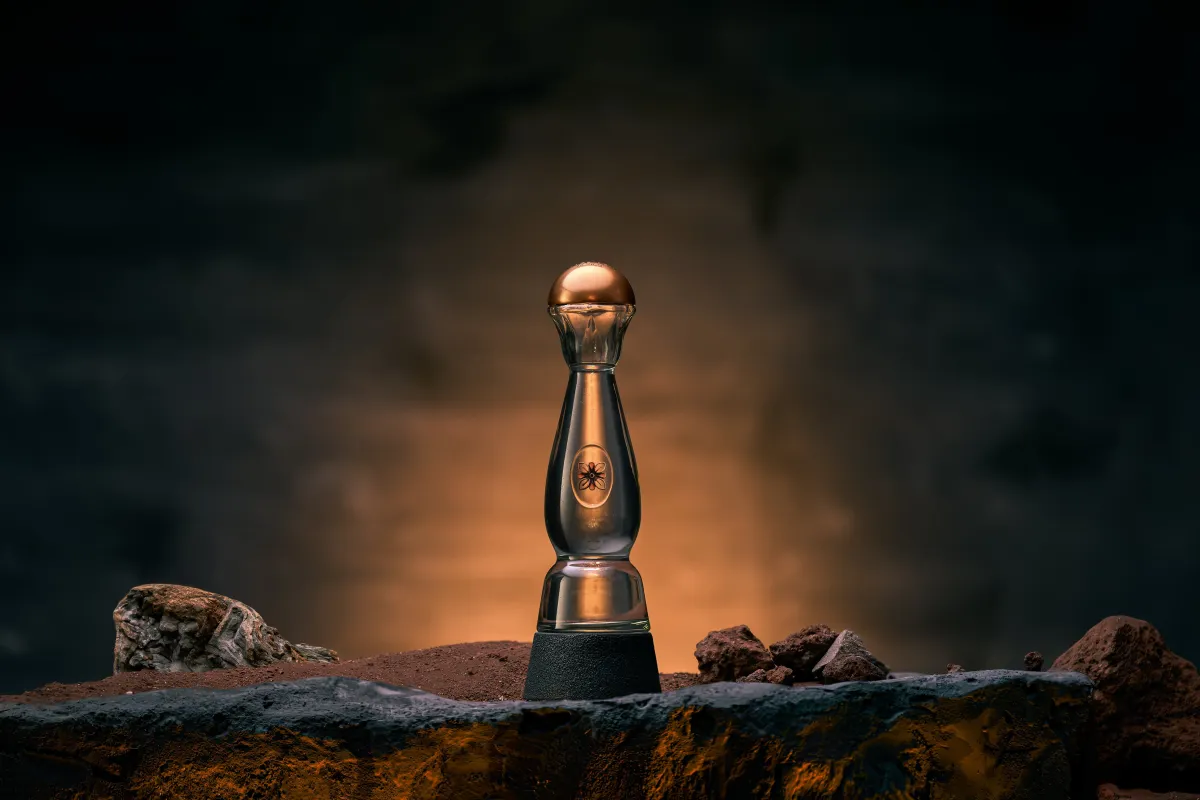 クラセアスールのデキャンタは、メキシコの職人による手仕事で仕上げられ、単なる容器ではなく芸術作品としても楽しめるものです。今回のデザインは、ピットオーブンでの火入れ時に立ち上る煙をイメージしており、ボトル全体を包む半透明のガラスは、それを見る者にスモーキーな香りを連想させます。また、基部には火山岩の質感を再現した黒いセラミックが使用され、自然の力を象徴しています。加えて、銅色のキャップとエンブレムは蒸留器へのオマージュであり、製造過程を視覚的に表現しています。