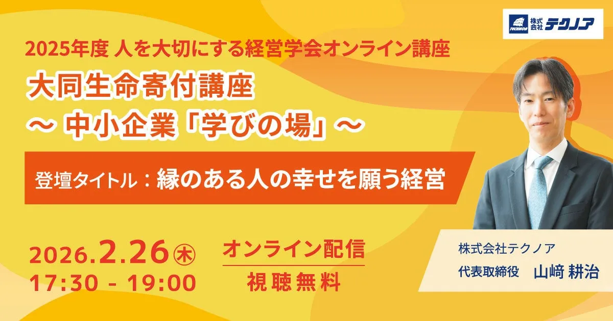 株式会社テクノアの代表取締役、山﨑耕治氏が、2026年2月26日(木)に開催される「2025年度 人を大切にする経営学会オンライン講座」で講演を行います。この講座は、中小企業の経営者や幹部を対象に、人を大切にする経営の実践例やその背景について学ぶ機会を提供します。