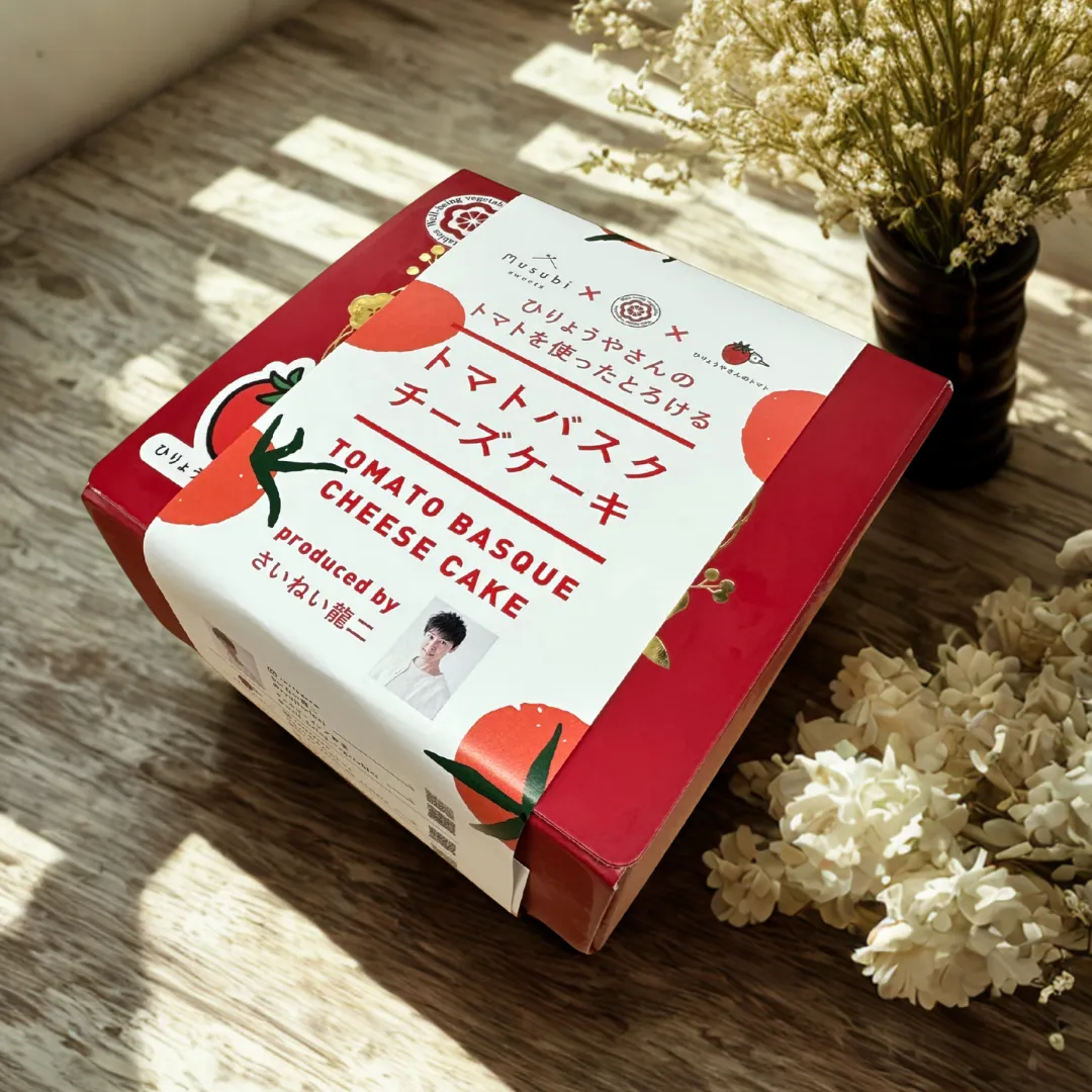 このコラボスイーツは、地元広島のタレントであり農家でもあるさいねい龍二さんが発案。彼が立ち上げたウェルビーイング野菜プロジェクトに参加する「ひりょうやさんのトマト」と、テレビで出会ったスイーツを製造する「むすびスイーツ」がつながり、夢のコラボが実現しました。彼が考案した特製トマトソースは、トマト、チーズケーキとの絶妙な組み合わせを生み出しました。