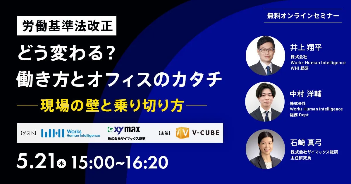 2026年5月21日(木)に開催される無料オンラインセミナー「労働基準法改正、どう変わる? 働き方とオフィスのカタチ 現場の壁と乗り切り方」では、仕事のスタイルとオフィス環境が大きな変化を迎える中、労働基準法改正についての重要情報を提供します。このセミナーには、株式会社ブイキューブ、Works Human Intelligence、ザイマックス総研から専門家が参加し、働き方改革と労務管理の最新情報を解説します。
