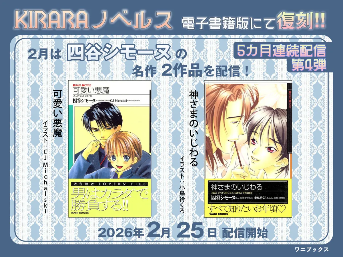 2026年2月25日、株式会社ワニブックスからレジェンドBL作家・四谷シモーヌの名作が電子書籍として復活します。今回の復刻は、『可愛い悪魔』と『神さまのいじわる』の2作品で、どちらも90年代の「キララノベルス」で刊行され、今なお色褪せない魅力を持っています。これからのBL作品に期待を寄せる読者には嬉しいニュースです。