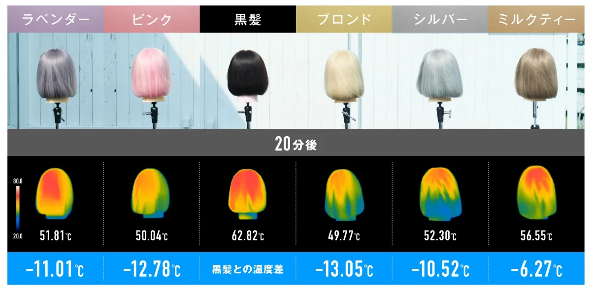 実験は、黒髪ウィッグと明るい色のウィッグを用いて行われ、計測は3分、10分、20分後に行われました。結果、明るい髪色を持つウィッグは、時間の経過と共に黒髪との差が拡大。ブロンドやピンクのようなハイトーン毛は、太陽光を反射しやすく、温度の上昇を抑えられる傾向が示されました。特に20分後の計測では、ブロンドウィッグが62.82℃に対して、ブリーチ毛は49.77℃に留まる結果となりました。