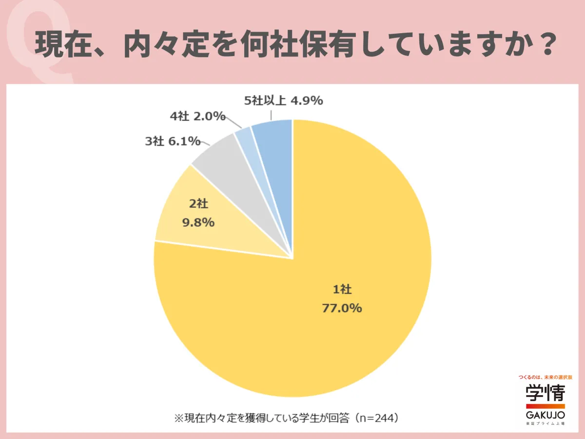 調査によれば、内々定を持っている学生の約77%が1社のみの内定を持つ一方で、22.8%の学生は複数社から内々定を得ているとのことです。これは、特に8月下旬から9月初めの時期において顕著で、多くの学生が慎重に企業を選んでいることを示しています。