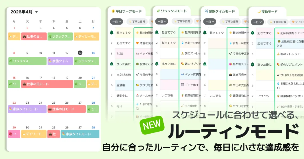 特に社会人や学生、シフト勤務をする人々にとって、この柔軟性は大きな利点です。例えば、平日と休日で異なるリズムを持つ会社員や、授業期間と休暇期間で生活のスタイルが大きく変わる学生にとって、この機能は非常に有効です。固定されたルーティンに囚われず、自分の生活に合ったリズムを自由にデザインできる点が、多くのユーザーに評価されています。