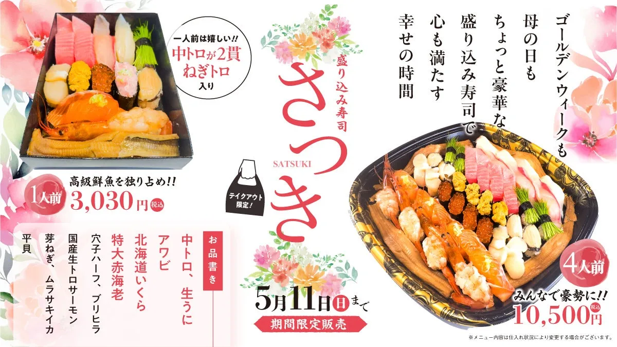 春の訪れと共に、家族や友人との特別なひとときを彩る「さつき」は、活美登利が贈る期間限定の豪華な盛り合わせです。2023年4月21日から5月11日までの間、春のイベントシーズンにぴったりなこの特別メニューが楽しめます。ゴールデンウィークやこどもの日、母の日と、家族と一緒に過ごす機会が増えるこの季節に、ぜひ味わっていただきたい逸品です。