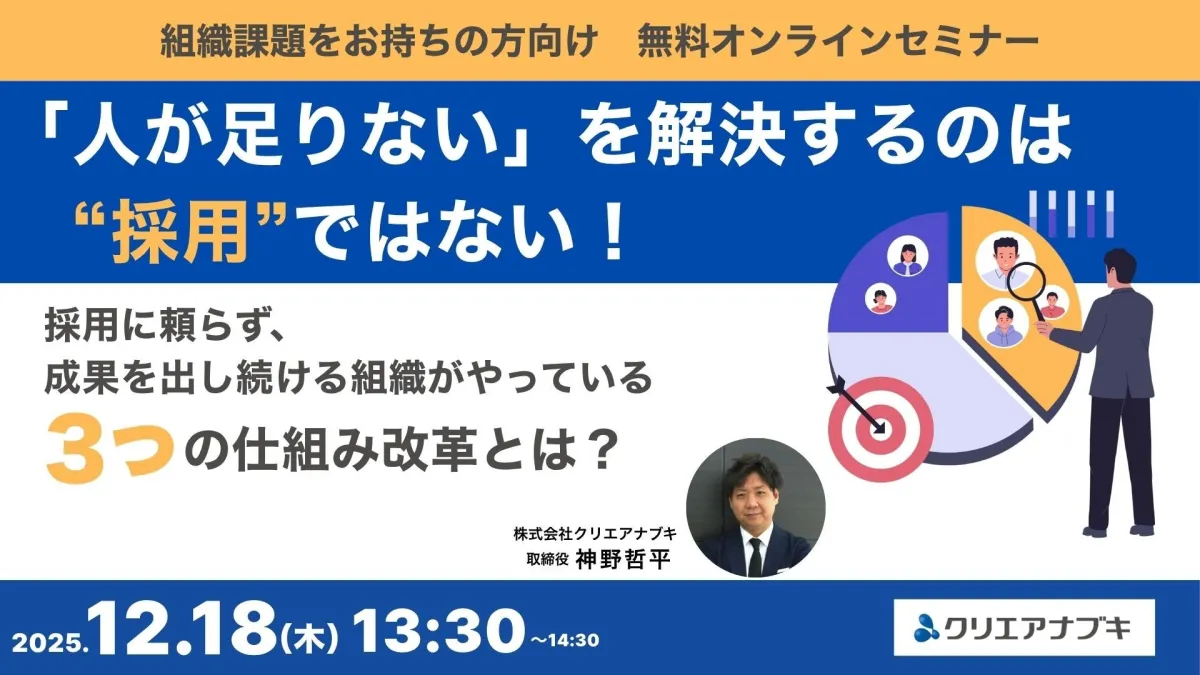2025年の12月18日、株式会社クリエアナブキが無料オンラインセミナーを開催します。テーマは「人が足りない」を解決するのは、“採用”ではない!。このセミナーでは採用に頼らず成果を出す組織のための3つの仕組み改革を紹介します。