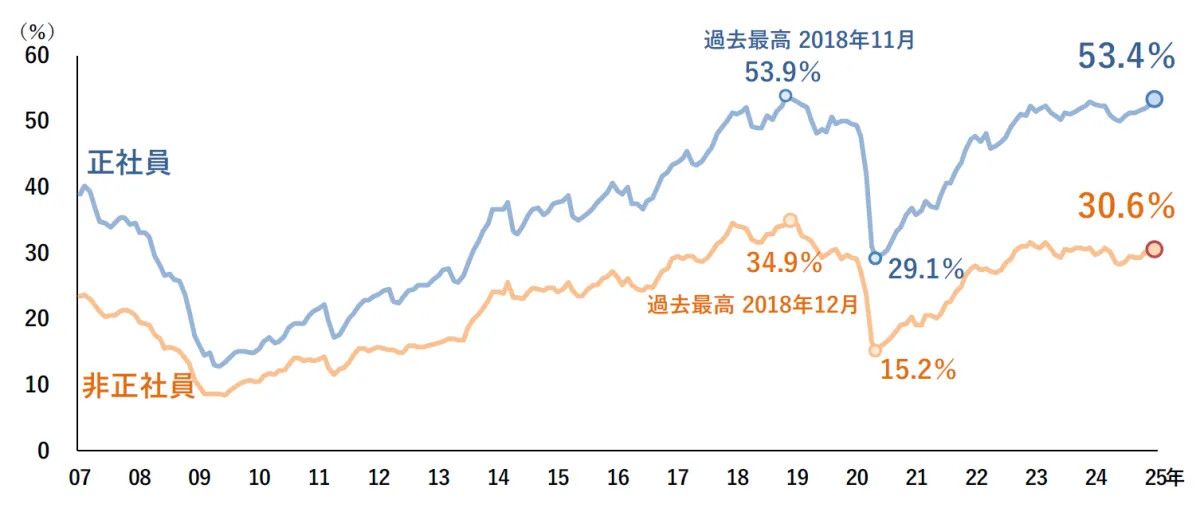 株式会社帝国データバンクが行った調査によると、2025年1月時点で正社員の人手不足を感じる企業が53.4%に達し、これはコロナ禍以降で最も深刻な状況です。非正社員の不足感も30.6%と高止まりしています。このデータからは、日本の労働市場が如何に逼迫しているかが明示されています。